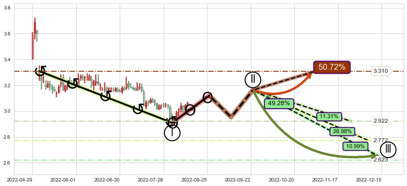 ➣ 循环浪继续向下【平均值】位置(2022-12-07, 2.772),匹配聚类样本比例54.75%, 可能性概率26.98%