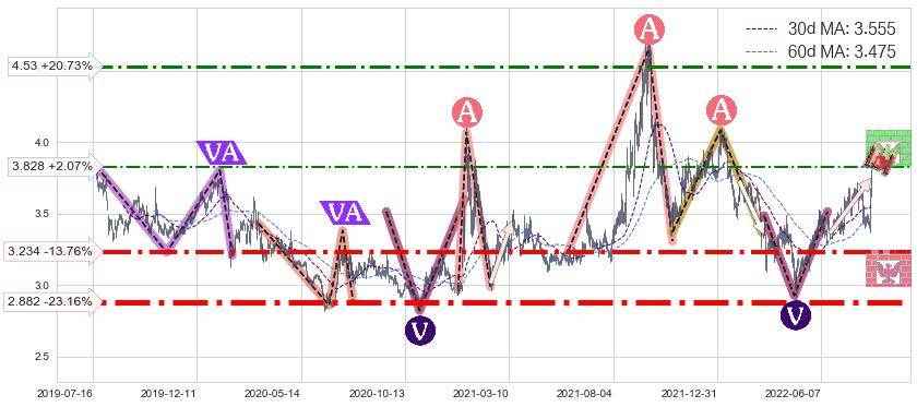 ♘ 阻力价格位3.828,可信任强度54.67%,距离最后交易2022-08-12形成的收盘价格3.750相差 +2.07%