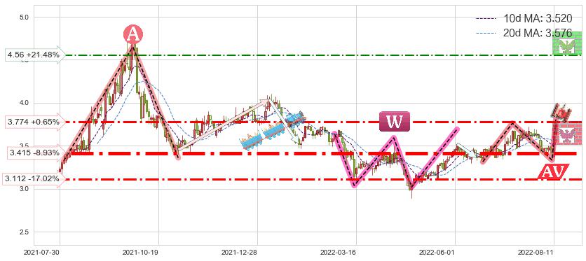 ♘ 支撑价格位3.415,可信任强度91.03%,距离最后交易2022-08-12形成的收盘价格3.750相差 -8.93%