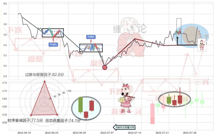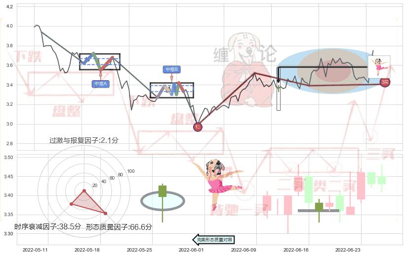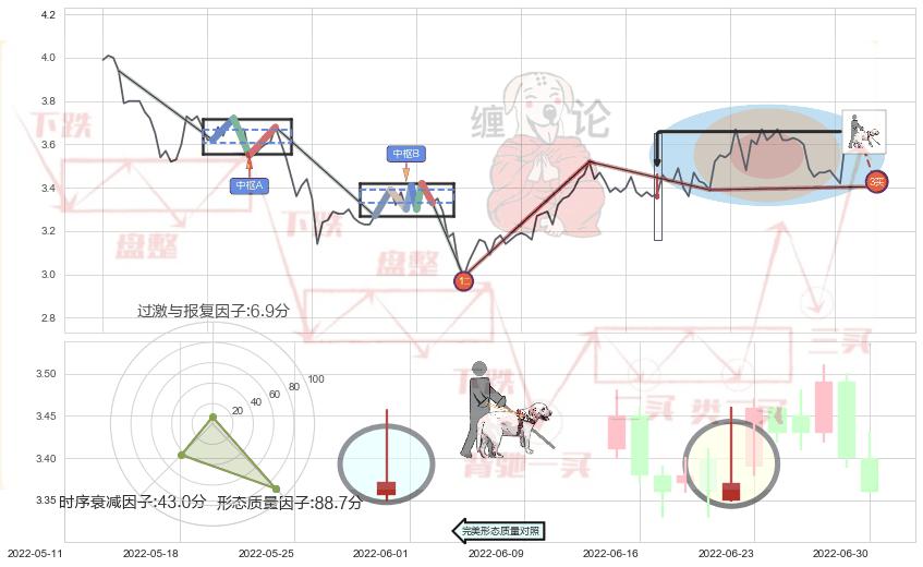 ➣ 【中枢B】:2022-03-30-2022-04-18,中枢由7笔构成,共12交易日, ZG=3.390, ZD=3.330