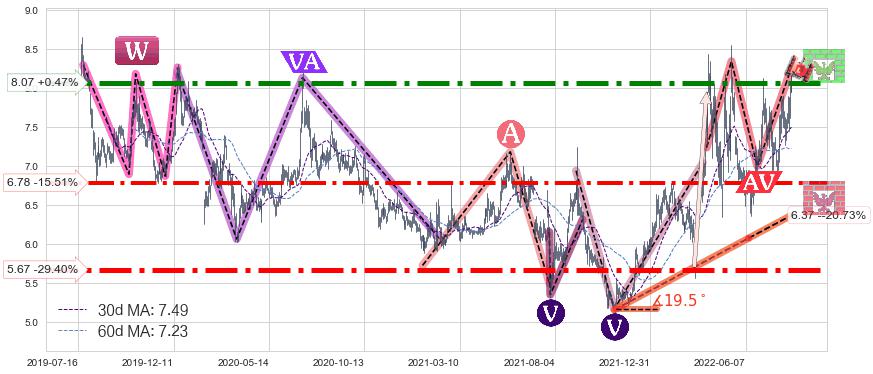 ➣ 【仅预测突破】最后价格:8.03与预测突破价格:6.44→【空间较大】后续最小【反转】第一目标价格→(2022-10-07: 4.62 )