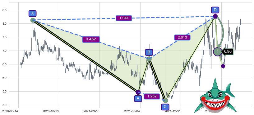 ➣ 谐波鲨鱼:已到达d点:猜想c拉升到达d点后泄力性下沉下跌(均值回复)
