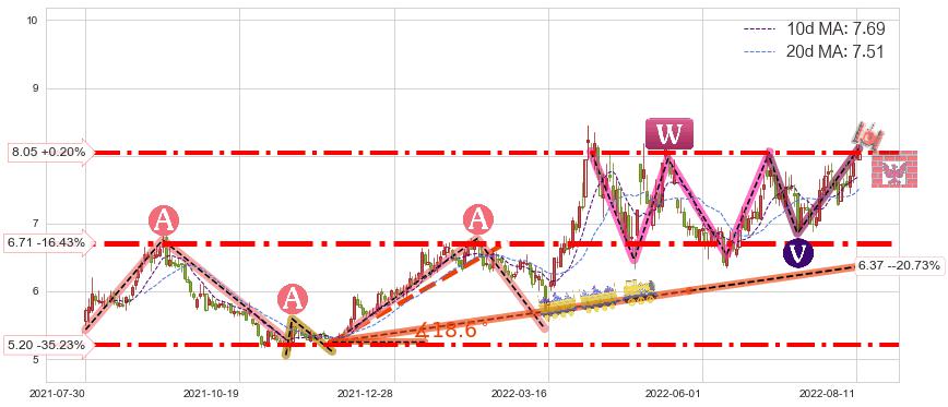 ♘ 支撑价格位6.71,可信任强度92.74%,距离最后交易2022-08-12形成的收盘价格8.03相差 -16.43%