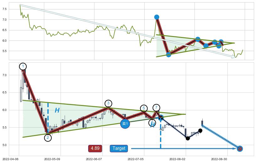 ➣ 【多空双方观望→争持→促使价格波动日益狭窄→空方打破攻守平衡点】对称三角形中继整理, 已在2022-07-15突破【支撑】颈线 5.78 →演变成下降通道