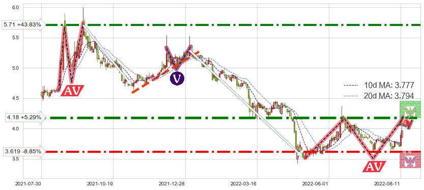 ♘ 阻力价格位4.18,可信任强度87.54%,距离最后交易2022-08-12形成的收盘价格3.970相差 +5.29%