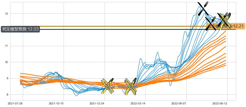 ➢ 45小时均线于(2022-08-08: 12.61)形成【死叉】基于【死叉历史模型】预测死叉后最低波谷价格: 11.92, 死叉后最低价格12.39,尚未达到预测最低波谷价格, 预期继续下跌