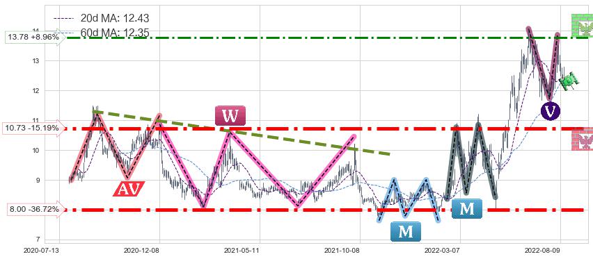 ♘ 阻力价格位13.78,可信任强度55.37%,距离最后交易2022-08-12形成的收盘价格12.65相差 +8.96%