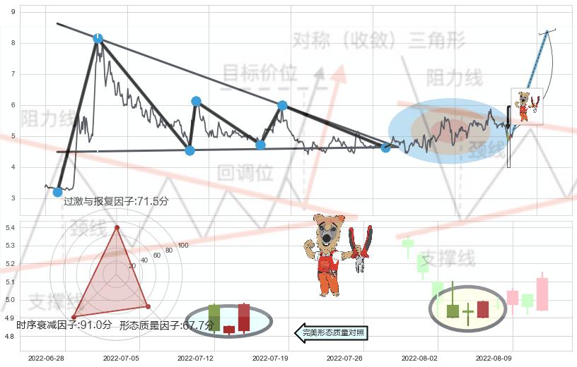 ➢ 锤头线(锤子线) 🔜 上升对称三角整理阻力突破转换支撑上涨 综合量化分数:56.46 【偏多】