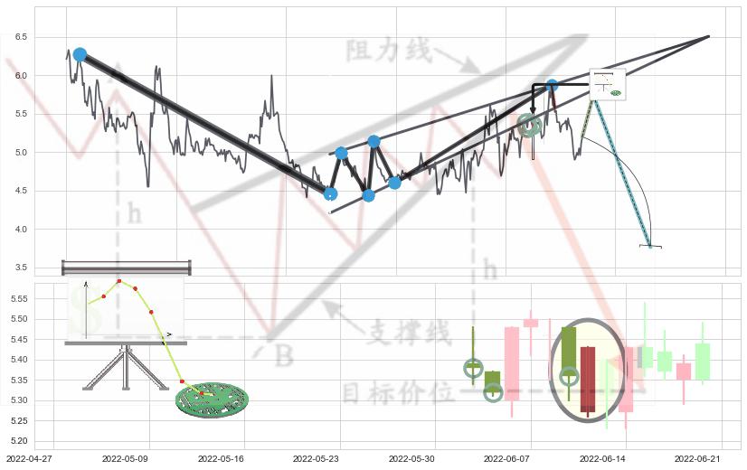 ♘ 阻力价格位5.75,可信任强度90.29%,距离最后交易2022-08-12形成的收盘价格5.20相差 +10.59%