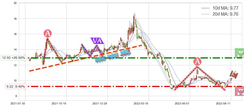 ♘ 支撑价格位9.22,可信任强度73.00%,距离最后交易2022-08-12形成的收盘价格10.18相差 -9.40%