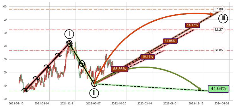 ➣ D点拟合预测价格31.29,距离最后交易收盘价格55.04相差 -43.15%