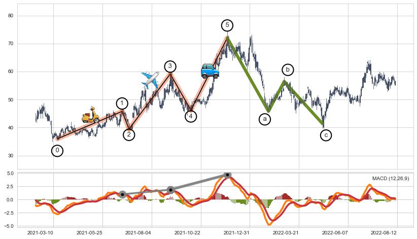➣ ['回调abc识别为: 【锯齿型调整浪】 ', '锯齿型:子浪535结构 ⓑ点振幅较小,ⓒ点继续发力远超ⓐ点结束位置']