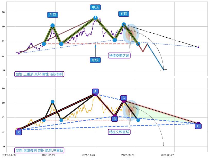 ➢ 三重顶与谐波伽利信号事件周期长度级别相同,同周期信号事件