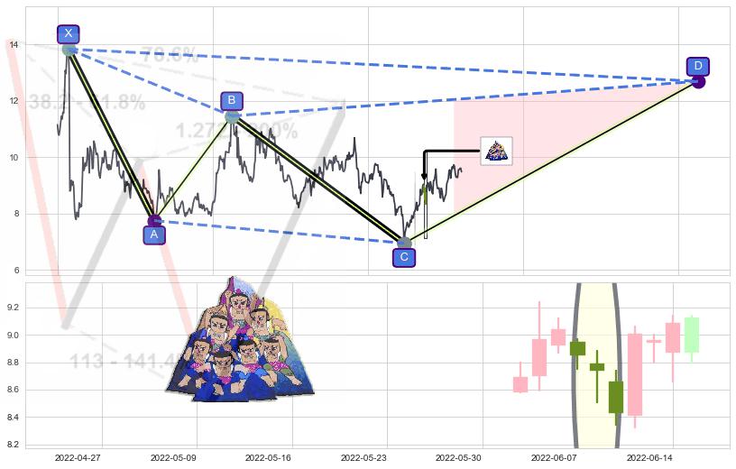 ➢ 谐波赛福:b持续蓄力下跌击穿越过c:猜想报复性拉升 → 上涨 →【拐点】强支撑临近 → 大趋势均值回复