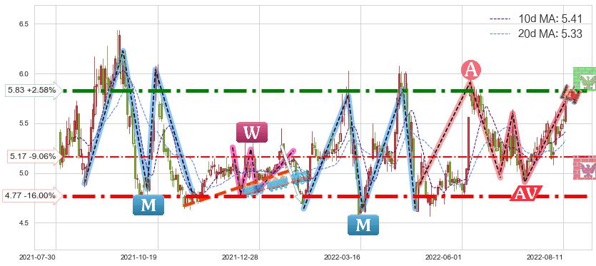 ♘ 阻力价格位5.83,可信任强度94.80%,距离最后交易2022-08-12形成的收盘价格5.68相差 +2.58%