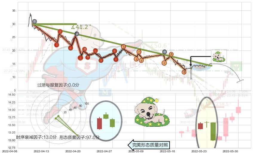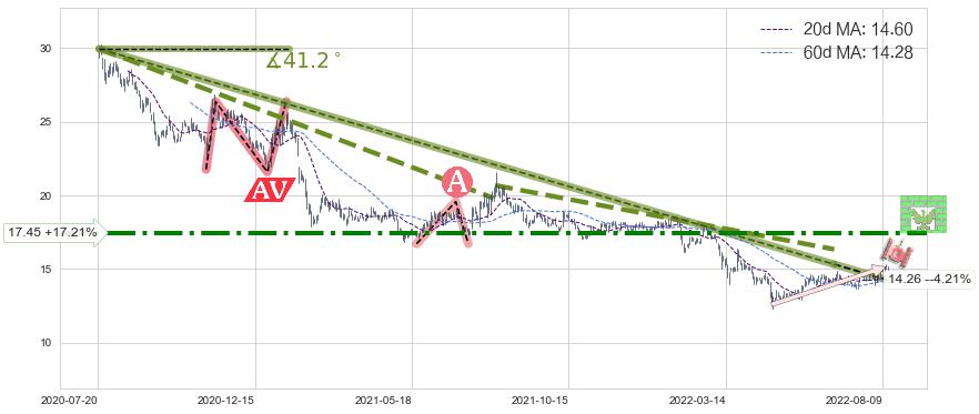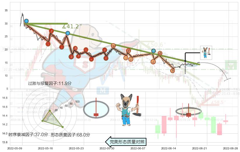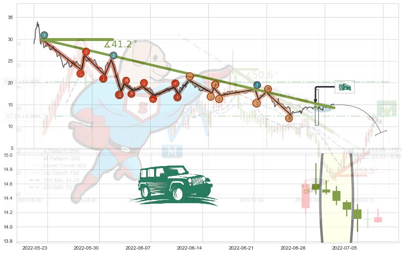 🦴 长线均值回复组合短线趋势跟踪[强阻力信号]2020-07-21-2022-06-27下跌趋势依然成立(下跌趋势跟踪依然存在),短线价格略微上行反弹(均值回复猜想),即将接近下跌趋势提供的未破位阻力价格:14.26。