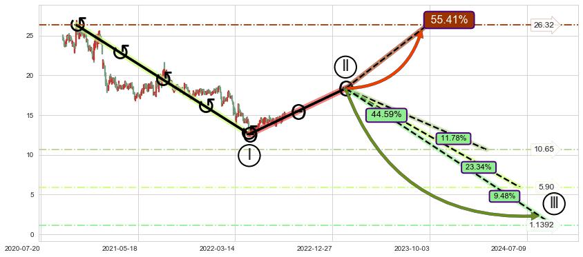 ➢ 循环浪继续向下【最高】位置(2024-03-14, 10.65),匹配聚类样本比例26.41%, 可能性概率11.78%