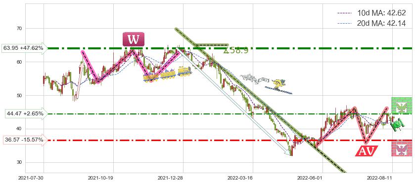 ♘ 阻力价格位44.47,可信任强度52.35%,距离最后交易2022-08-12形成的收盘价格43.32相差 +2.65%