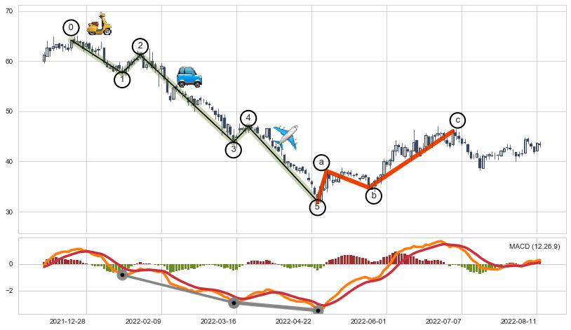 ➣ 波浪理论:猜想达到c点后小反弹终止反转下跌 → 下跌 → 【拐点】临近 → 阶段均值回复结束后继续大周期趋势跟踪