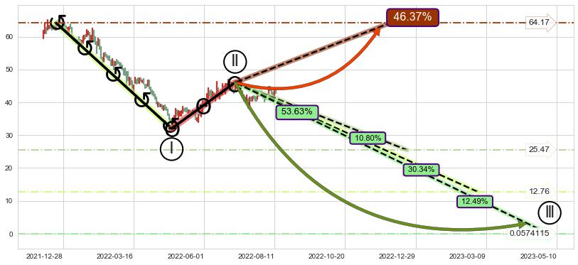 ➢ 看跌(高位倒锤头)流星线 + 波浪理论c点反弹终止反转下跌信号叠加后【反向回撤率】极高,【看空】信号叠加【存续影响极小】