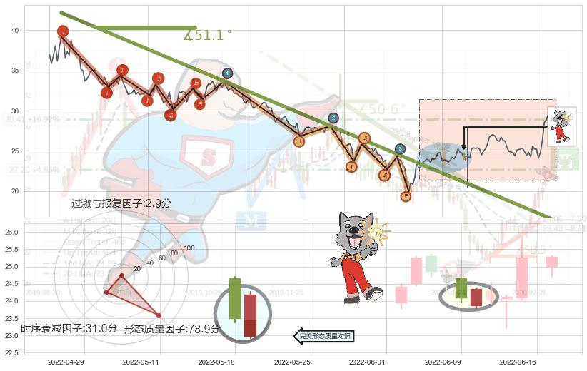 ➢ 2021-07-30-2022-05-20下跌趋势存在反转上涨[机会],其原下跌趋势的阻力位(16.38)已被突破[强支撑信号],原下跌趋势角度: 51.1˚