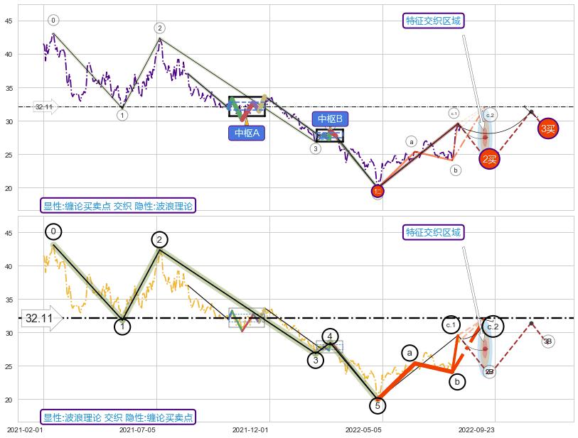 ➢ 【中枢A】:2021-10-12-2021-11-25,中枢由6笔构成,共33交易日, ZG=32.74, ZD=31.92