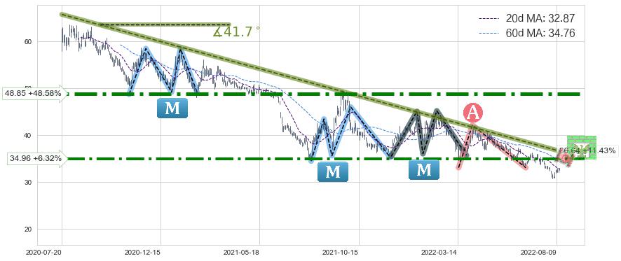 ♘ 阻力价格位34.96,可信任强度76.48%,距离最后交易2022-08-12形成的收盘价格32.88相差 +6.32%