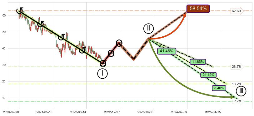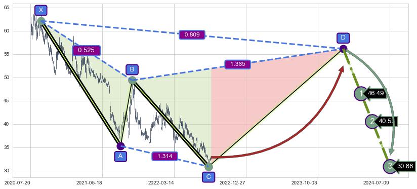➣ D点拟合预测价格56.14,距离最后交易收盘价格32.88相差 +70.73%