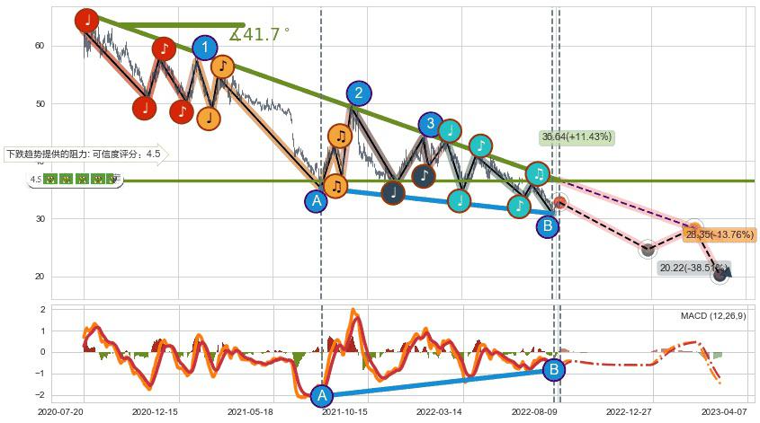 ♘ 在最后的下跌阶段2020-07-20至2022-08-12,存在 持续未破位的阻力位 ,阻力价格36.64,可信任强度88.80%,其距离最后价格32.88相差 +11.43%