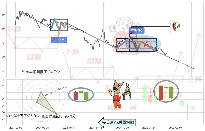 ➢ 下降三角整理支撑破位转换阻力下跌 🔜 缠论中枢点破位中枢B支撑下拉 综合量化分数:39.96 【偏空】