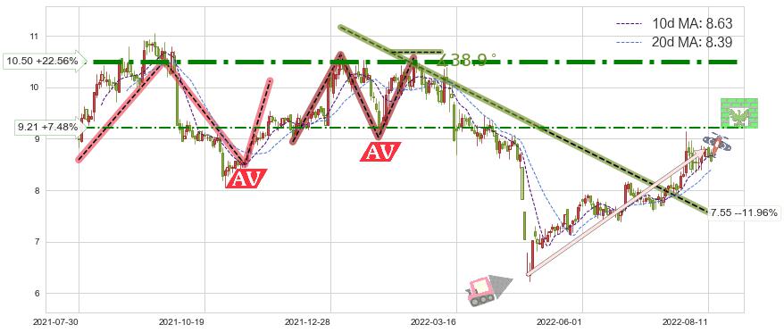 ♘ 阻力价格位10.50,可信任强度94.89%,距离最后交易2022-08-12形成的收盘价格8.57相差 +22.56%