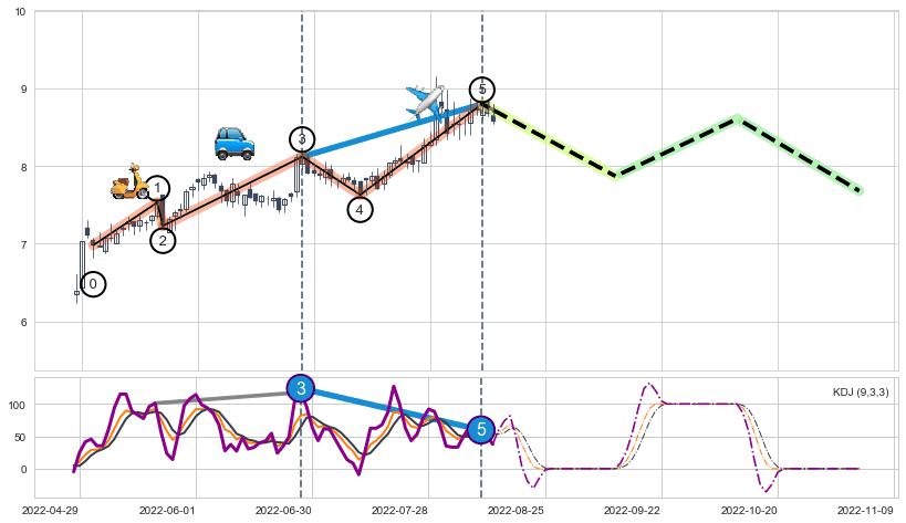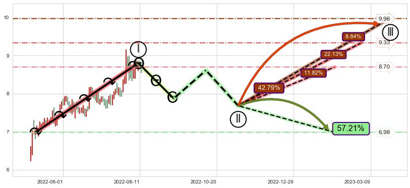 ➢ 循环浪继续向上【最低】位置(2023-02-06, 8.70),匹配聚类样本比例27.62%, 可能性概率11.82%