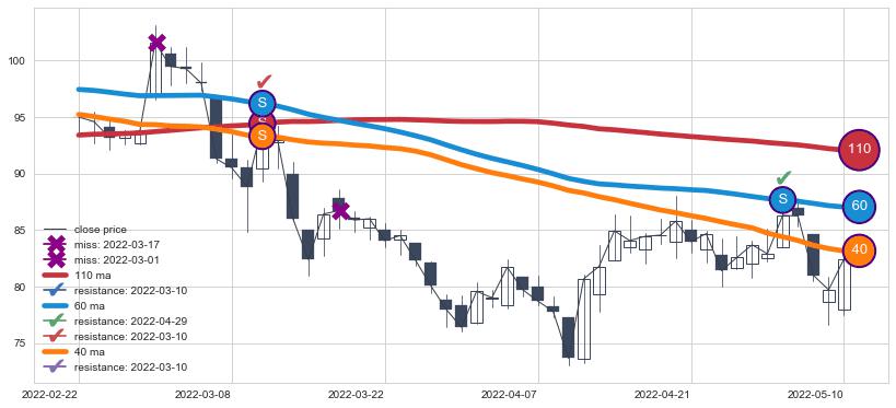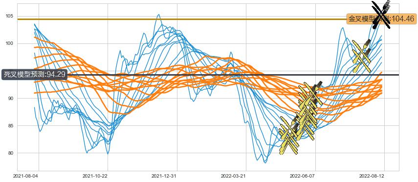 ➣ 60小时均线于(2022-05-25: 85.38)形成【金叉】基于【金叉历史模型】预测金叉后最高波峰价格: 98.60, 金叉后最高价格109.50,已经上涨超出预测最高波峰价格, 预期回调