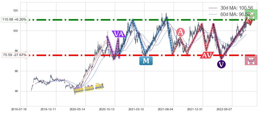 ♘ 阻力价格位110.98,可信任强度96.02%,距离最后交易2022-08-12形成的收盘价格104.50相差 +6.20%