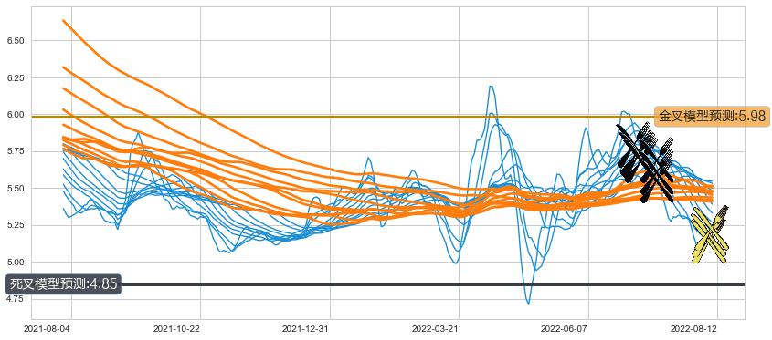 ➢ 25小时均线于(2022-06-30: 5.79)形成【死叉】基于【死叉历史模型】预测死叉后最低波谷价格: 5.19, 死叉后最低价格4.98,已经下跌超出预测最低波谷价格, 预期反弹