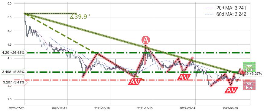 ♘ 阻力价格位3.498,可信任强度81.62%,距离最后交易2022-08-12形成的收盘价格3.320相差 +5.35%