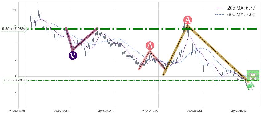 ♘ 阻力价格位9.85,可信任强度94.37%,距离最后交易2022-08-12形成的收盘价格6.70相差 +47.08%