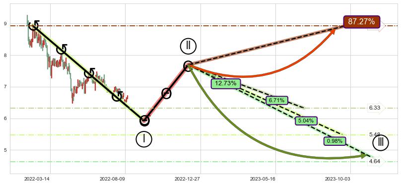 ➢ 循环浪继续向下【最高】位置(2023-07-07, 6.33),匹配聚类样本比例52.71%, 可能性概率6.71%
