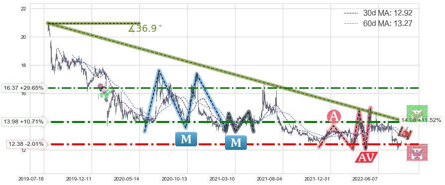 ♘ 阻力价格位16.37,可信任强度67.52%,距离最后交易2022-08-12形成的收盘价格12.63相差 +29.65%