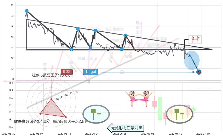 ➢ 【多方力量耗尽,空方打破攻守平衡点】下降三角形中继整理, 已在2021-07-30突破【支撑】颈线 13.65 →演变成下降通道