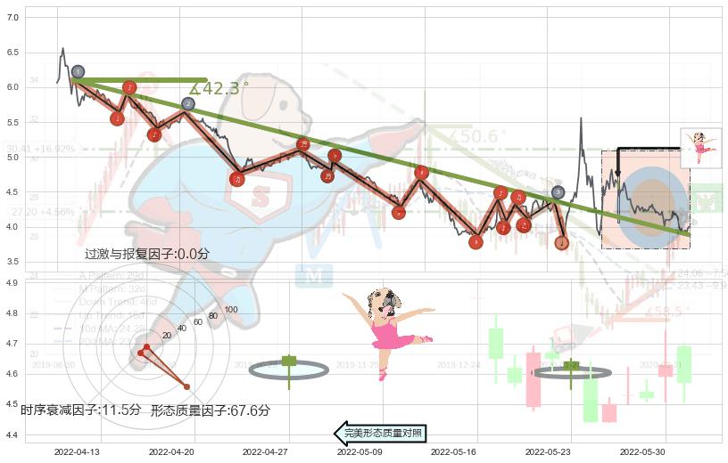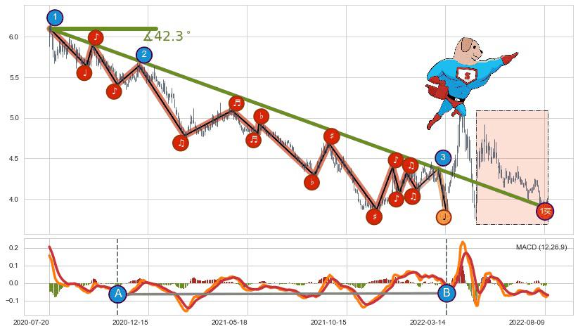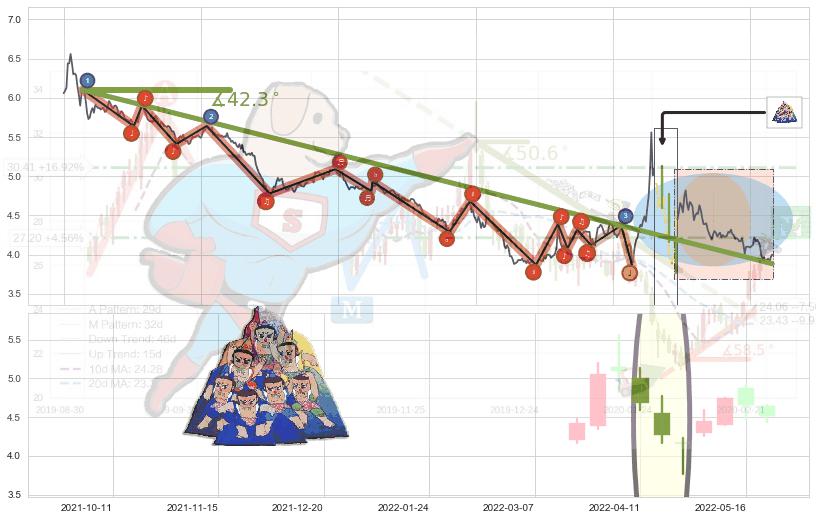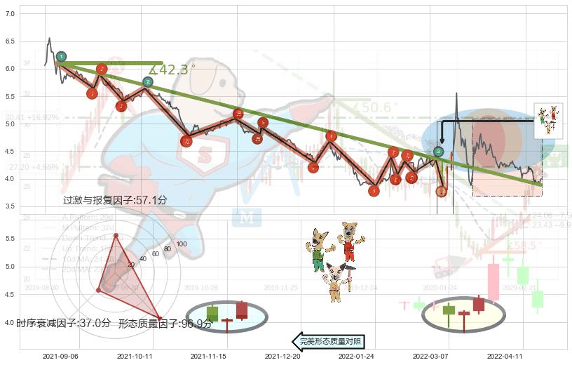 ➣ 2020-07-21-2022-04-01下跌趋势存在反转上涨[机会],虽然原下跌趋势的阻力位(3.885)已被突破,但其阻力效果尚存,原下跌趋势角度: 42.3˚