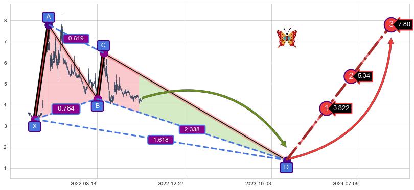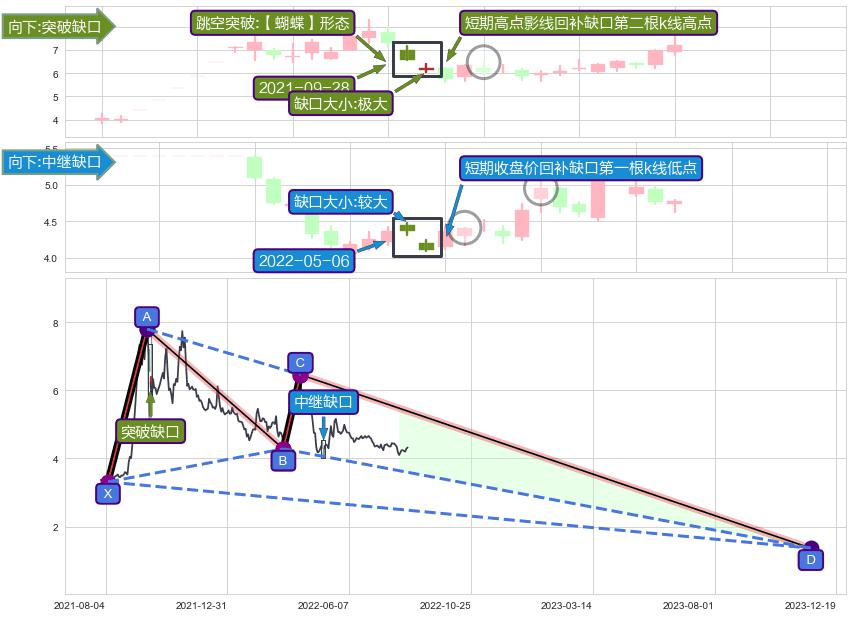 ➣ 未完成【蝴蝶】形态起点X: 2021-08-06, 已到达C点: 2022-04-06, 预测最终D点: 2023-11-20, 共571交易日