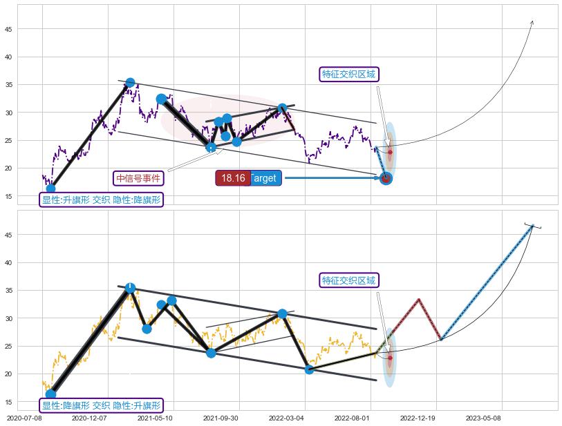 ➣ 上涨身怀六甲 + 升旗形临近target支撑拐点上涨信号叠加后【信号初始稳固度】高,【看多】信号叠加【可信度影响大】