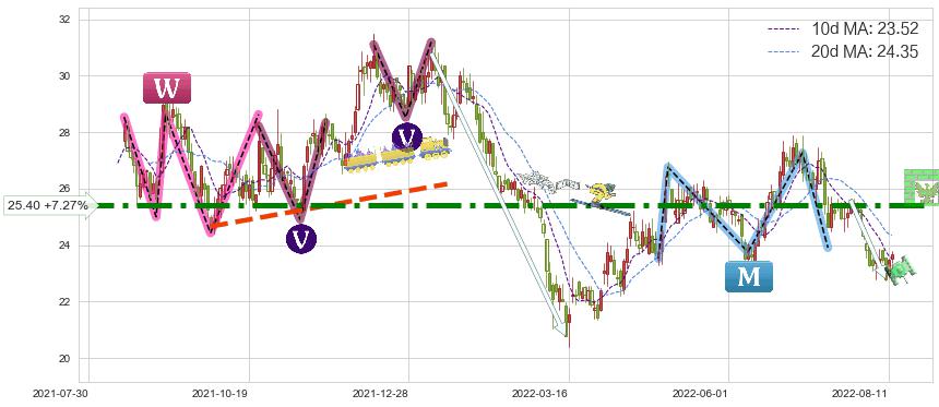2021-08-30: 第一阻力位25.40有效抑制了下跌浪,成功阻止了价格的继续下跌。