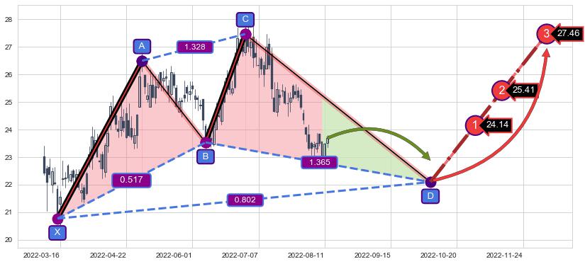➣ 谐波赛福:c下跌临近d:猜想拉升 → 上涨 →【拐点】强支撑临近 → 大趋势均值回复
