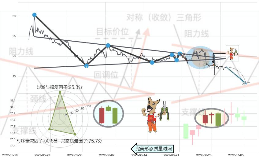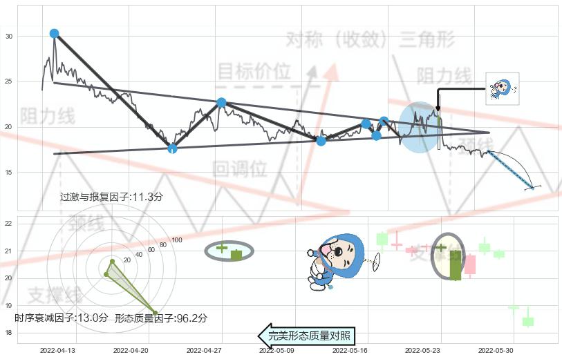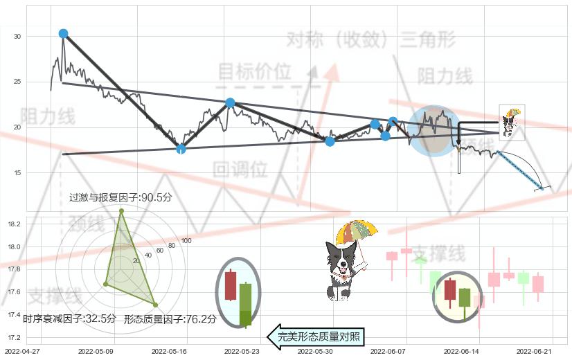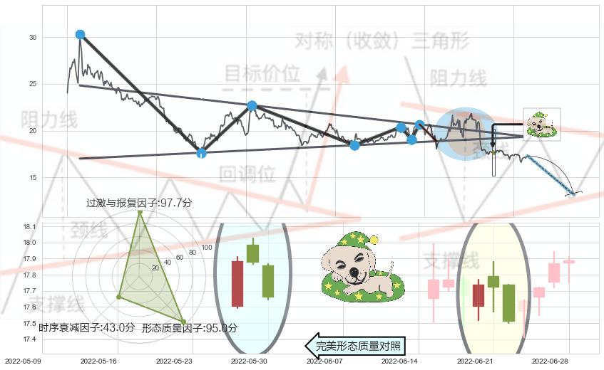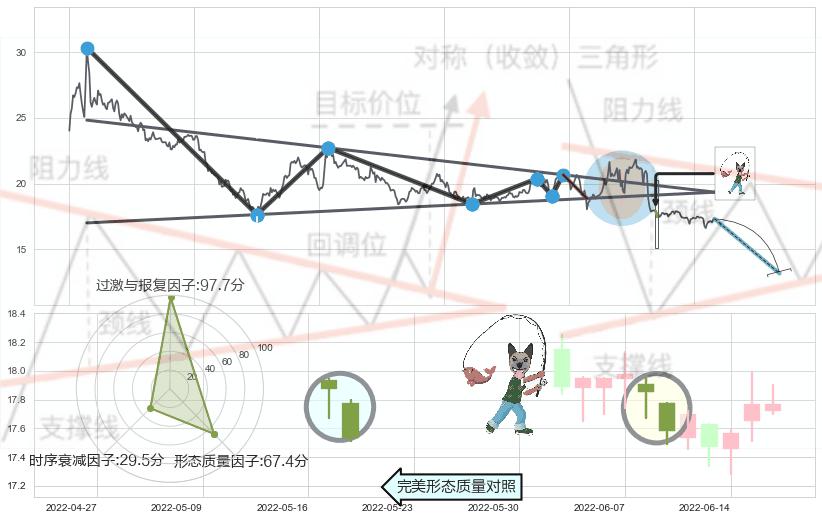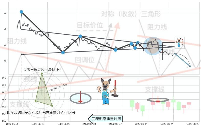 ➢ 下跌镊子线(n形磁铁) 🔜 下降对称三角整理支撑破位转换阻力下跌 综合量化分数:44.99 【偏空】