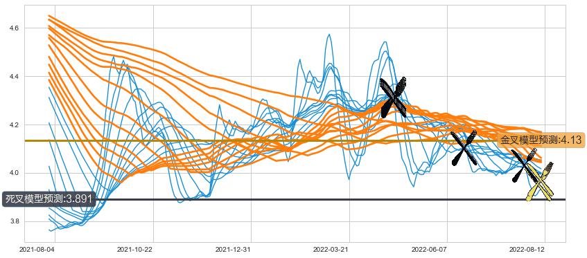 ➣ 40小时均线于(2022-04-22: 4.31)形成【死叉】基于【死叉历史模型】预测死叉后最低波谷价格: 4.02, 死叉后最低价格3.870,已经下跌超出预测最低波谷价格, 预期反弹