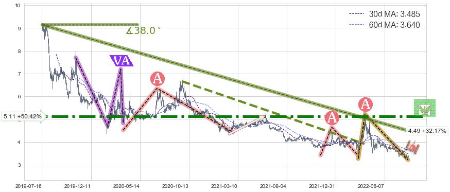 从2019-07-17至2022-08-12,共包含748个交易日,阶段股价下跌-77.04%,阶段股价变动位移路程比: 1 : 15,下跌趋势角度: 38.0
