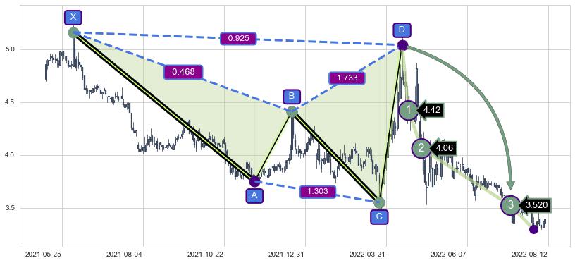 ➢ 谐波赛福:d下跌已到达第❸目标:猜想支撑拉升 → 上涨 →【拐点】机会信号 → 大趋势均值回复