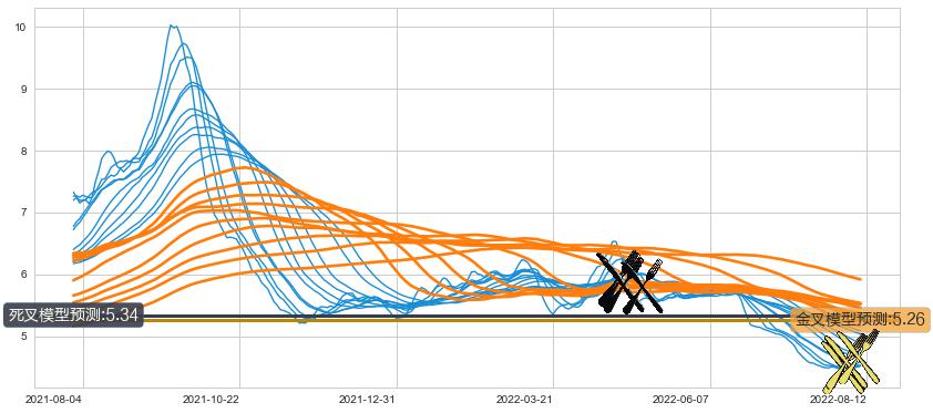 ➣ 90小时均线于(2022-04-22: 5.80)形成【死叉】基于【死叉历史模型】预测死叉后最低波谷价格: 5.27, 死叉后最低价格4.39,已经下跌超出预测最低波谷价格, 预期反弹